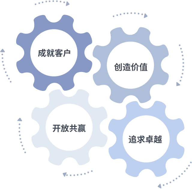 成就客户是一切决策的出发点,,,,创造价值是衡量所有工作的标准,,追求卓越是我们做事做人的态度,,,,开放共赢是我们的格局也是最终的结果。。。。价值观的齿轮环环相扣,,,,推动着组织里的每个人不断向前。。