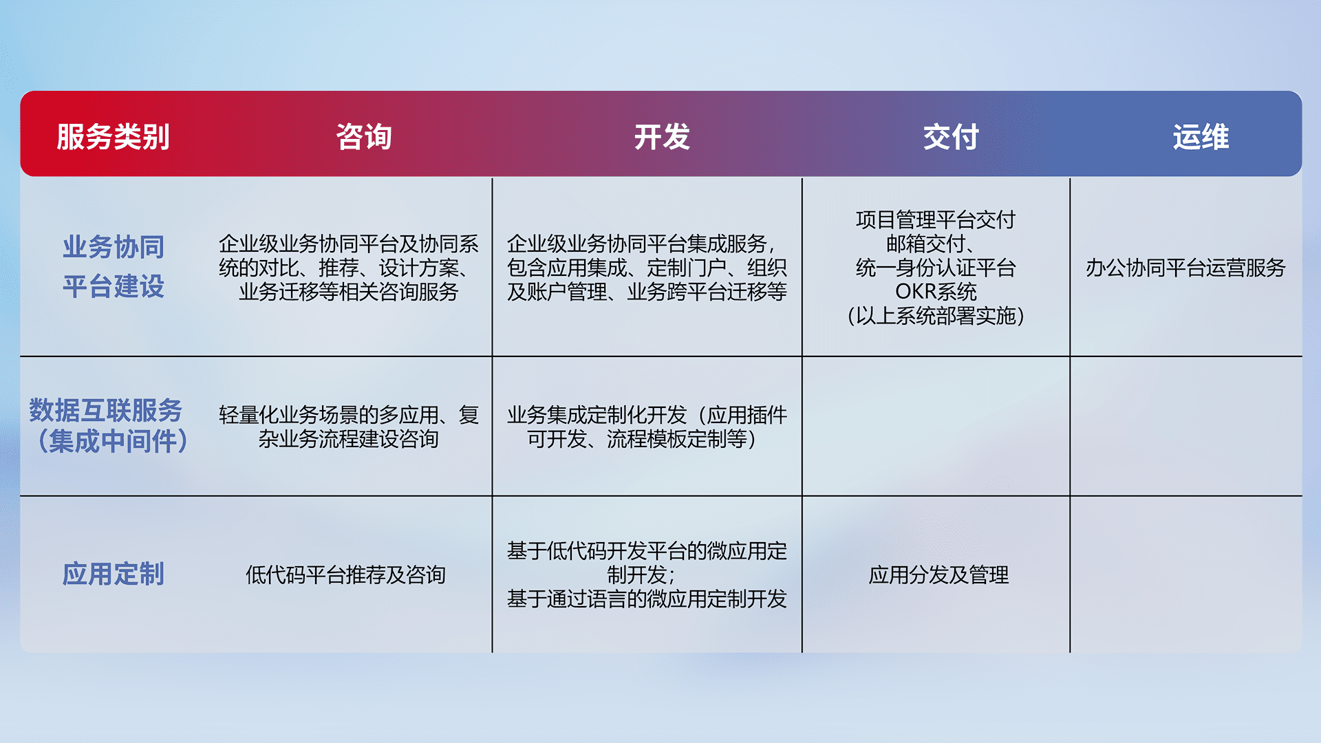 针对钉钉、、、、企微、、、IDaas等平台级产品提供产品的规划、、、方案、、、交付、、、、定制化开发等服务,,实现如统一协同办公、、智能客户服务、、、混合会议管理、、智能数据查询、、等业务场景,,,,实现数字化转型。。。
