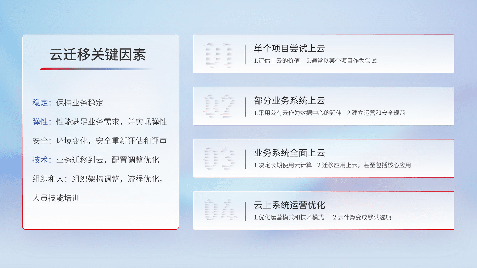 结合实际业务,,,,从规划设计、、、、云平台选型、、云原生改造、、数据迁移、、、、集成交付,,,,迁移全过程为客户识别最佳上云路径,,做好风险识别管理,,,设计网络架构、、、身份权限、、安全审计合规、、操作审计、、、日志审计、、、、监控告警策略、、、、多站点容灾设计等,,,,对云上基础设施进行整体规划,,,,提升IT治理水平,,,,以满足弹性、、、、高可用、、、、高性能的需求。。。。