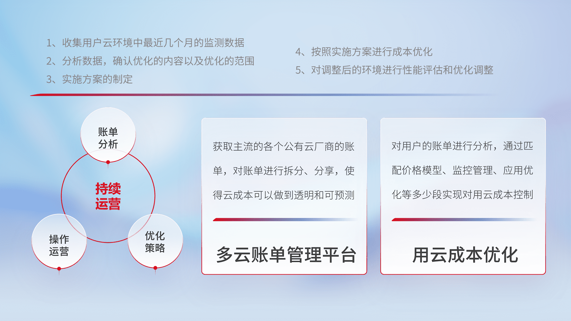 通过多云纳管,,,,以统一的资源数据模型把客户的云资源进行抽象和封装,,,进而实现对多云资源的统一操作,,,,保障云资源管理的可靠性、、稳定性与可用性。。。。量身定制化运维内容,,,,配置、、、开发运维、、、补丁管理、、备份、、监控、、认证和访问管理、、、、审计和日常巡检等,,,,保障在用云过程中的可靠度,,,,稳定度以及高可用率。。。
